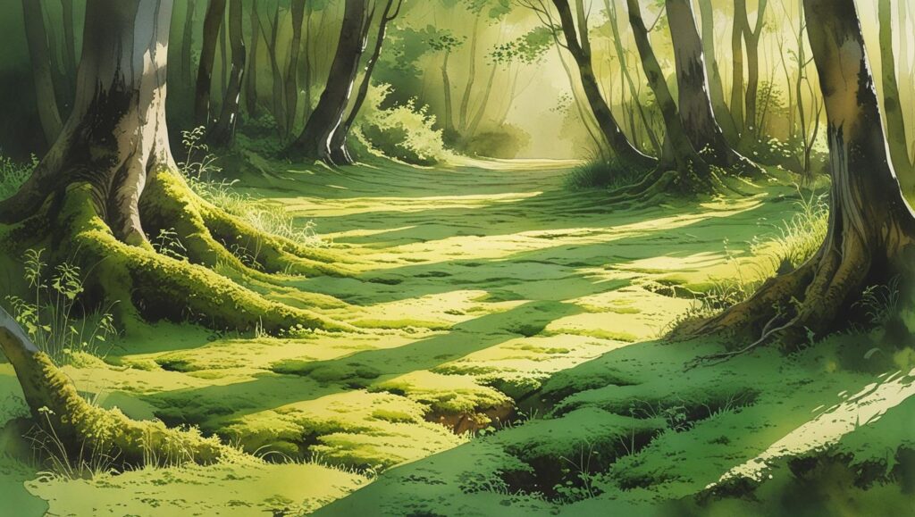 太陽の光がやわらかく差し込み、苔の絨毯がふかふかに広がっている。