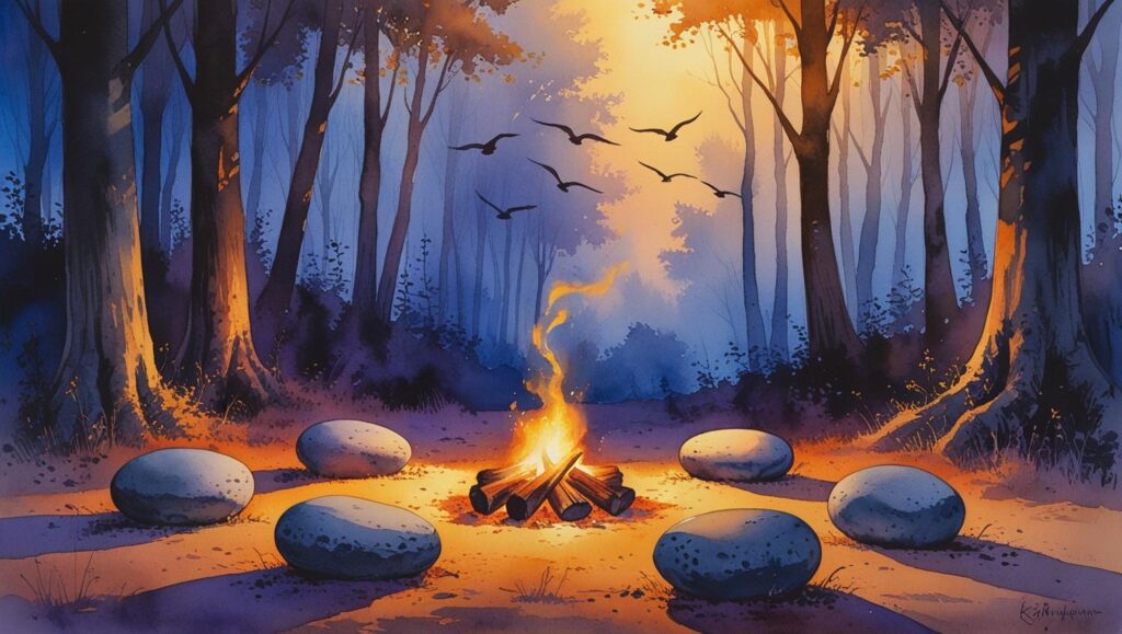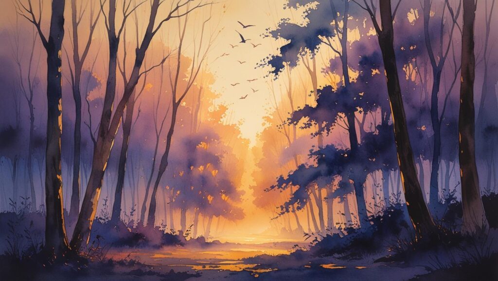 黄金色の光が木々を透かし、鳥たちが帰り道を告げる声が響く。